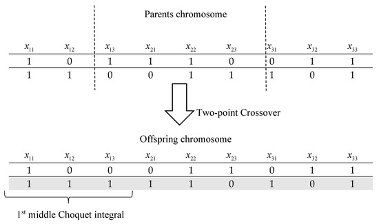 Crossover. The main objective of the crossover was to exchange information between two parent chromosomes and produce two new offspring for the next generation. Several crossover operators could be investigated, such as one-point, two-point, and mask-crossover operators. However, we employed the two-point crossover and set the crossover probability to be equal to 0.8. For example, if we consider three input variables and three sub-Choquet integrals, the design of the crossover here is presented in Figure 3.