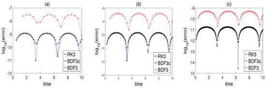 which presents a stiffness by varying the parameter . The analytic solution of problem is given by . To compare the error behaviors of the two methods, we set up the parameter so that the given problem can be highly stiff. Here, the exact solution of this problem is set by . In Figure 1, we display absolute errors at each integration step in a log scale obtained by the two methods with different time step sizes , (a) , (b) and (c) . One can see that the error of BDF3 (Red) has magnitude (a) , (b) , and (c) . The error of RK3 (Blue) has magnitude (a) , (b) , and (c) . All three graphs in Figure 1 show that RK3 has better accuracy than BDF3. Additionally, to demonstrate the meaning of the stage of multi-stage methods and the step of multi-step methods, we set up a time step size of the multi-step method, BDF3, as . The result of BDF3 with is labeled as BDF3c hereafter. It can be seen that the result from BDF3c (Black) has the same accuracy, compared with RK3. Therefore, it is sufficient to see a comparison of RK3 and BDF3c for further comparison.