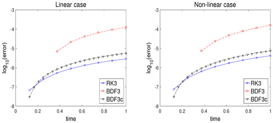 As similar to the previous subsection, the error behaviors of two methods for both linear and nonlinear cases are observed over time, and the results are plotted in Figure 2. The error is measured as -norm at each integration step, . For the nonlinear case, a traditional Newton iteration is used for a linearization. As mentioned in the previous subsection, BDF3c uses a smaller time step size and is compared with RK3 with time step h. Just in case, we mention that BDF3 with time step h is not appropriate to compare RK3 with the same time step size because of the meaning of the stage, explained in the previous subsection. In the linear case, , RK3, and BDF3c have similar error behaviors as and at the final time point, respectively. In the nonlinear case, , RK3, and BDF3 also have similar error behaviors as and at the final time, respectively.