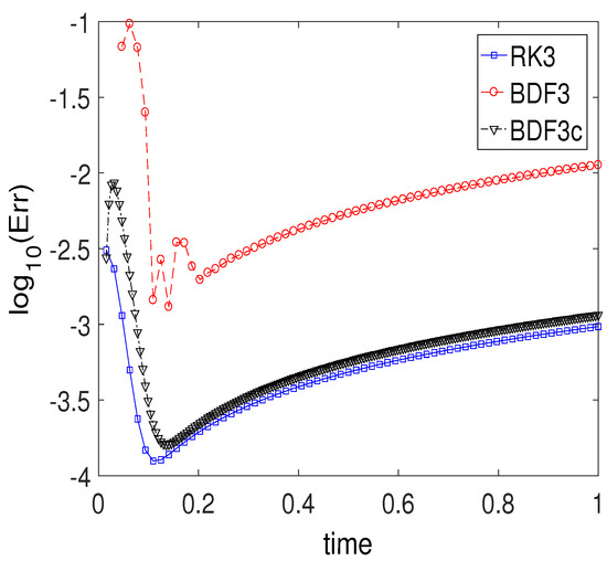 Here, the coefficients are constants. If method (2) use previous solution values with either or , the method is called an step method. A BDF method is the most efficient linear multi-step methods among several multi-step methods [40]. It is composed of the coefficients and the others chosen such that the method with the convergence order of s convergence order s. Thus, the s-step BDF has s-th convergence order. The BDF3 is given by