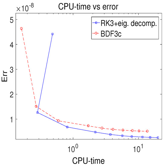 Figure 4 can be good evidence of the conclusion that RK3 with eigenvalue decomposition technique is more efficient than the BDF3 method. More precisely speaking, BDF3 requires more computational costs to obtain a similar magnitude of accuracy. In addition, RK3 combined with the eigenvalue decomposition technique can obtain higher accuracy for the same cost.