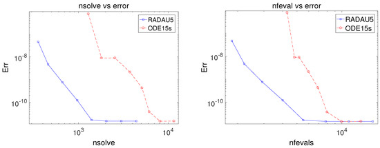 Specifically, results independent of computational resources were measured to compare the efficiency of two methods in this example. The number of times that nonlinear solvers are called (nsolve) and the number of function evaluations (nfeval) are measured by varying relative tolerance () and absolute tolerance () as . We also measure an -norm error at the end time for each tolerance and plot the error in a logarithm scale as a function of nsolve (left) and nfeval (right) in Figure 5. These figures show that RADAU5 generates smaller errors, compared with ODE15s, for paying a similar computational expenses. From a different perspective, RADAU5 requires less computational resources than ODE15s to get similar level of errors. Thus, we can claim that RADAU5 has better performance in terms of computational costs and accuracy than ODE15s.