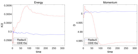 In Figure 7, one can see that the behaviors of the energy and the momentum over time interval . As observed in Figure 7, RADAU5 gives a maximum variation of and for the energy and the momentum, whereas ODE15s presents a variation of and for them. Therefore, one can conclude that RADAU5 has better conservation properties, compared with ODE15s.