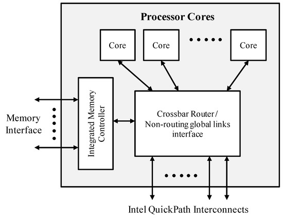 Figure 1 is a block diagram of a multi-core processor with external QPI. The processor has one or more cores, and it also typically comprises one or more integrated memory controllers. The QPI is a high-speed point-to-point interconnection network. Although it is sometimes classified as a type of a serial bus, it is more accurately considered a point-to-point link, as data are sent in parallel across multiple lanes and its packets are broken into multiple parallel transfers. It is a contemporary design that uses some techniques similar to those seen in other point-to-point interconnections, such as peripheral component interconnect express (PCIe) and a fully-buffered dual in-line memory module (FB-DIMM). The physical connectivity of each link consists of 20 differential signal pairs and a differential forwarded clock. Each port supports a link pair consisting of two uni-directional links that connect two processors; this supports traffic in both directions, simultaneously [27]. Additionally, the QPI comprises a cache coherency protocol to maintain the distributed memory and caches coherent during system operation [28].