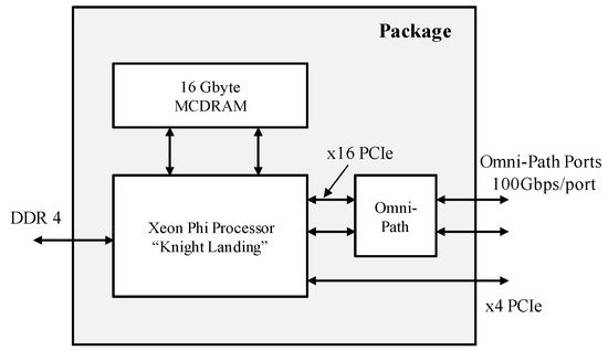 The up-to-date Intel Xeon Phi processor, codenamed “Knight Landing” (KNL), comprises 36 processor tiles, where each processor tile consists of two cores, two vector processing units (VPU), and 1 MByte L2. All processor tiles are interconnected to 2D mesh interconnection, and the interconnection among Xeon Phi processors is an Intel omni-path fabric interconnection [29,30,31]. Figure 2 is a block diagram of an Intel Xeon Phi Processor with omni-path fabric interconnection. The omni-path fabric is connected through the two x16 lanes of PCI express to the KNL die, and it provides two 100-Gbits-per-second ports, out of the package [32].