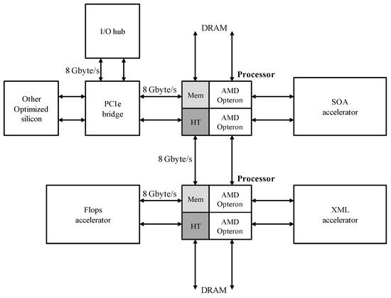 AMD also uses a crossbar to interconnect cores and the interconnection among processors is HyperTransport, which is a high-speed point-to-point interconnection network similar to Intel QPI [33,34]. Figure 3 is a block diagram of an AMD processor with HyperTransport interconnection, which provides scalability, high bandwidth, and low latency. The distributed shared-memory architecture includes four integrated memory controllers (i.e., one per chip), giving it four-fold greater memory bandwidth and capacity compared to traditional architectures without the use of costly power-consuming memory buffers [35].