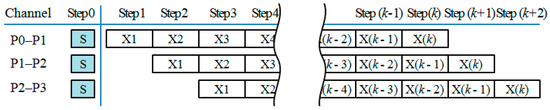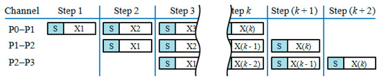 In the pipelined broadcast algorithm shown in Figure 5, we could see that k-iterative synchronization processes were needed in each pipeline step. Suppose that the number of cycles required for synchronization in one pipeline step is m cycles, and that the operating frequency is f MHz; then, the total synchronization time will be calculated as in Equation (2). This will incur an O(k) arithmetic cost, leading to inefficient channel throughput due to diminishing return as k increases.