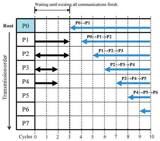Figure 11 shows the waiting time in the atomic pipelined broadcast with the initial transmission order change technique, when P1’s pre-existing transmission data size becomes larger. The P7→P1→P2 data transmission of P1 is delayed by two cycles, due to its pre-existing data transmission. Broadcast communications undertakes the synchronization before data transmissions; synchronization is a process to check if the communication ports of all processing nodes are available for broadcast communication. As described in Section 2.2, the pipelined broadcast algorithm is synchronized by propagating the request message from P0 (a head node) to the last processing node (a tail node), and the ready message from a tail to a head. In the figure, P1 receives the ready message at Cycle 4, but it remains in a buffer until the earlier messages are transmitted. Finally, P1 performs the ready message at Cycle 6; which means that the effective beginning cycle of broadcast communication is Cycle 2, even though it begins at Cycle 0.