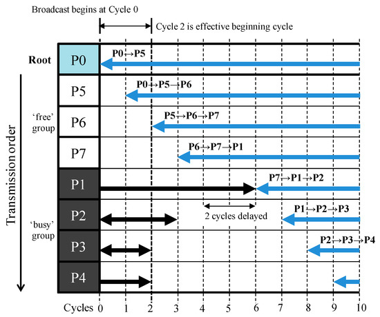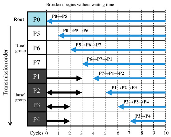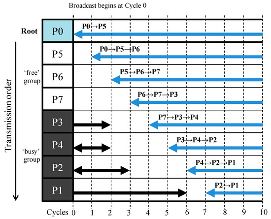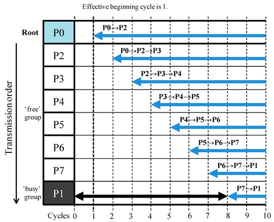 Figure 9 shows the transmission orders in the atomic pipelined broadcast algorithm with the initial transmission order change technique when P1–P4 have the existing ongoing transmissions. All processing nodes are sorted into the “free” or “busy” group, and the transmission order is determined in each group as per the pre-defined numeric order. Additionally, the free group is always in front of the busy group. In this way, the transmission order is changed to P0→P5→P6→P7→P1→P2→P3→P4, and the root P0 can begin the broadcast communication without waiting three cycles occurred in the case of Figure 8.