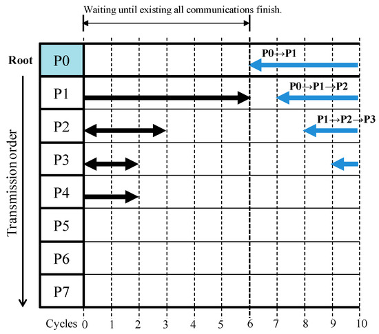 Figure 8 shows the transmission orders in the atomic pipelined broadcast algorithm without the transmission order change technique when P1–P4 have the existing ongoing transmissions. As shown in the figure, when performing broadcast communication in the situation with the pre-existing transmissions, a waiting time of three cycles is required, because the root P0 should wait until all the existing ongoing transmissions of P1–P4 finish.