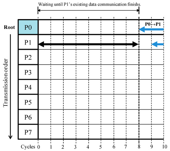 Figure 13 and Figure 14 show the transmission orders in the atomic pipelined broadcasts without and with the inter-node transmission order change technique, respectively, when P1 has the pre-existing data transmission. In Figure 13, the root P0 should wait for eight cycles until P1’s pre-existing data transmission finishes, because it cannot change the transmission order.