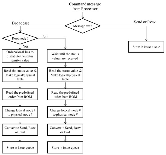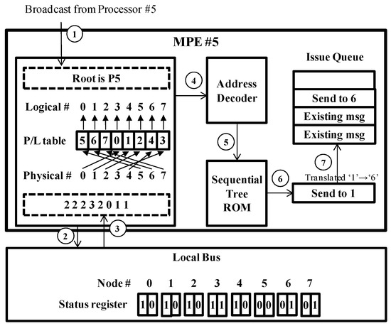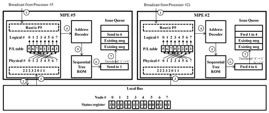 Figure 15 briefly shows the process sequence of the inter-node transmission order change technique, when the root node receives the broadcast operation. Detailed information is provided in Section 3.3. In this figure, the message passing engine (MPE) of the root P5 orders the local bus to distribute the value of the status register to all the MPEs. The status register had 2 bits for each processing node: 16 bits in total. In the initial transmission order change technique, this was 8 bits in total (i.e., 1 bit for each processing node). To support the proposed transmission order change technique, the size of the status register was increased to identify the pre-existing transmission data size. In Step ③ of Figure 15, the local bus distributes the status register value to all MPEs. The MPE arranges the processing nodes’ physical numbers in order, by the 2-bit value for each MPE. In this figure, the status register value was assumed to “10 10 10 11 10 00 01 01”; therefore, the processing nodes’ physical numbers were arranged into P5→P6→P7→P0→P1→P2→P4→P3. Then, the intermediate control message was generated by using the information of the sequential tree read-only memory (ROM) and physical/logical (P/L). The intermediate control message was translated to the final control message, and it was then stored in the issue queue.