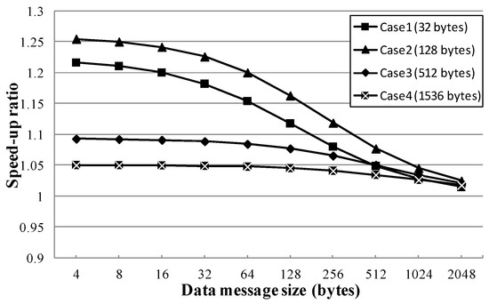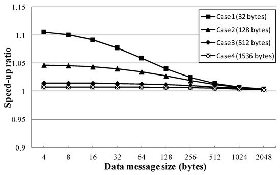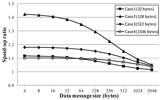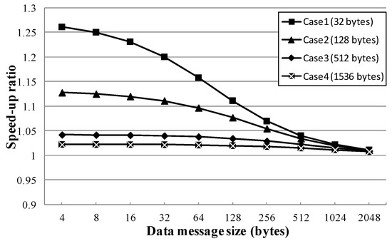 Figure 18, Figure 19, Figure 20 and Figure 21 show the speed-up ratios of the APOC algorithm when 4, 8, 16, and 32 processing nodes were in the communicator with the pre-existing data transmission, respectively, compared to the AP algorithm. In these simulations, only the P1 processing node had the pre-existing data transmission, and the pre-existing transmission data sizes were 32, 128, 512, and 1536 bytes, respectively.