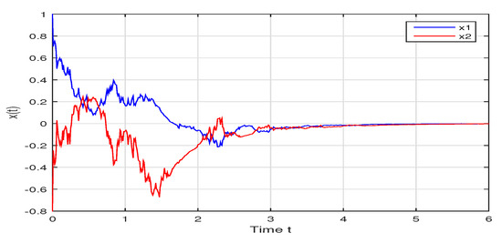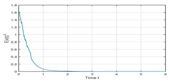 We select initial value and the impulsive interval . Figure 1 depicts the state of the uncertain impulsive stochastic system. It is obvious from Figure 2 that the closed-loop system is mean-square asymptotically stable, where which is the jth sample path.