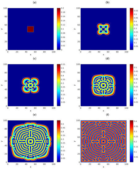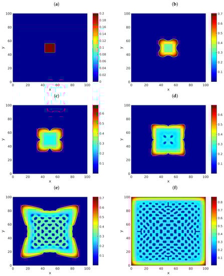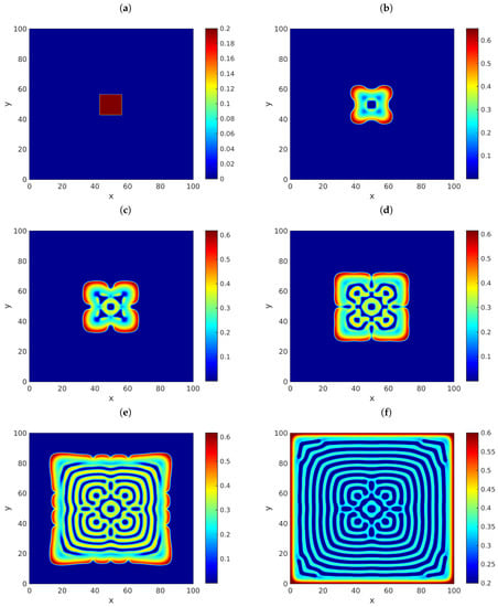 It is easy to see that this point is a stationary solution of (118), which is a model that describes the spatio-temporal dynamics of a predator–prey system without Allee effects. Obviously, this system is a particular form of the more general model (7). To approximate solutions of the present system of equations, we will let be any sample from a normally distributed random variable with the mean equal to and the standard deviation equal to . Meanwhile, will be equal to zero on all B, except on a central square at the middle of B, on which it will be constantly equal to . Let , , , , and . Figure 1 provides snapshots of the solution u in (118) at (a) , (b) , (c) , (d) , (e) , and (f) , using . The graphs exhibit the presence of complex patterns, in agreement with the results obtained in []. In those results, we agreed that and . For illustration purposes, Figure 2 and Figure 3 provide similar results for the cases when and , respectively. Turing patterns appear in those instances also, in spite of the fractional nature of those cases. In our simulations, we used our implementation of (20) shown in Appendix A, with and . Moreover, we imposed homogeneous Neumann conditions on the boundary of B.