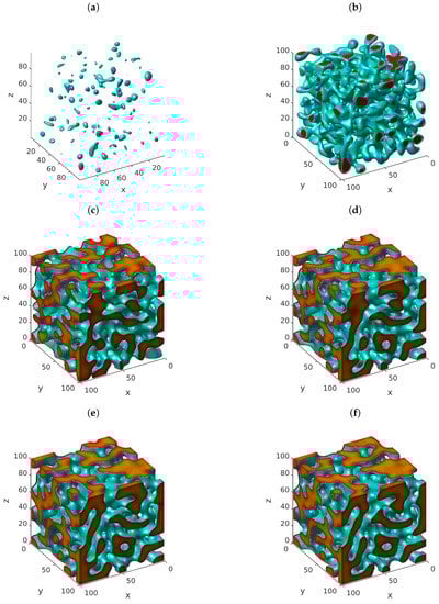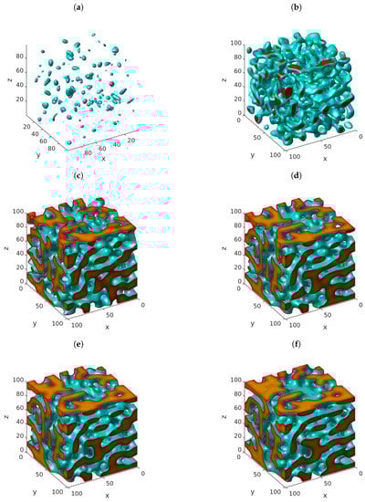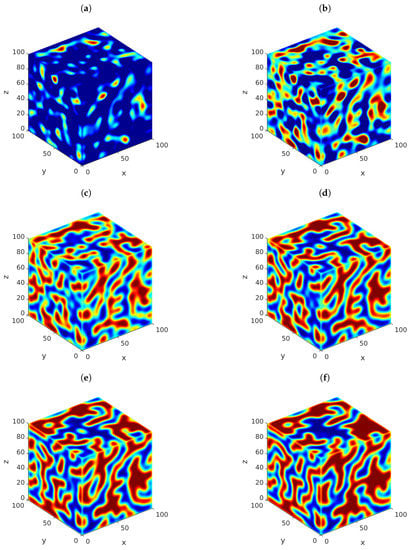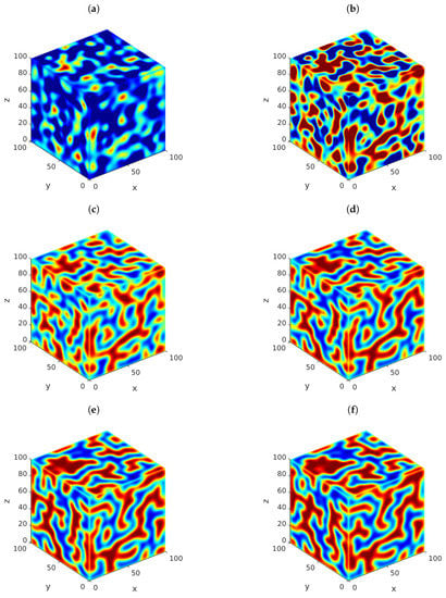 Snapshots of the approximate solution u of (118) versus x, y, and z. The parameters employed are , , , , , and . Meanwhile, we considered the times (a) , (b) , (c) , (d) , (e) , and (f) . The initial data are random samples of a uniform distribution on . The approximations were calculated using our implementation of (20), with and .
