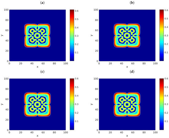 Consider the same mathematical problem of Example 1 with the model parameters,,,,, and. Fix the temporal period. Figure 8 shows the results of our simulations considering various values of the spatial partition norms. Throughout, we let. The graphs correspond to the values (a), (b),, and. A similar pattern shape was obtained in all cases. These results provide numerical evidence that the type of Turing pattern is independent of the discretization spatial step-size. We performed similar experiments considering different temporal steps. The simulations are not reproduced to avoid redundancy, but they prove that the emerging patterns are also independent of τ.