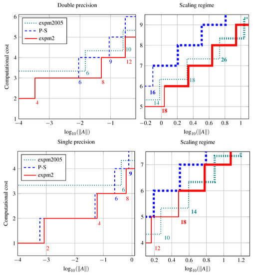 The right panels shows the scaling regime. We conclude that expm2 is superior (by matrix products) for around of the matrix norms considered in the graph and inferior (by ) for the remaining third. The percentage of the norm range where expm2 is cheaper can be computed by determining the points where both methods transition into the scaling regime, for expm2 at order 18 from and for expm2005 at order 26 for . The difference is approximately . For single precision, approximately the same conclusion holds. The corresponding points are for expm2 (order 18) and for expm2005 (order 14).