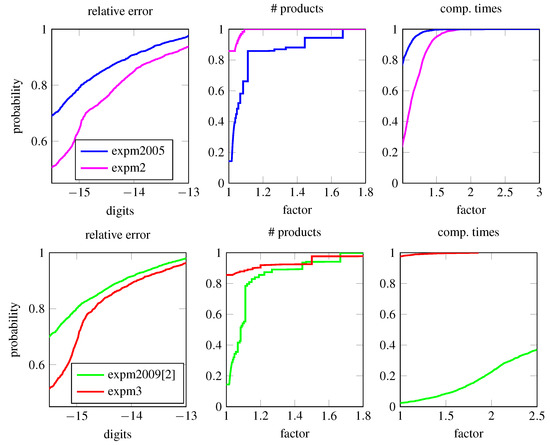 and the reference solution was obtained using Mathematica with 100 digits of precision. From the top left panel, we see that both methods have relative errors close to machine accuracy for a wide range of matrices. We appreciate that for some special matrices, both methods have the potential to reach errors below machine accuracy. The same holds for slightly larger errors: for some matrices, especially large ones, both methods produce relative errors above machine accuracy. The top right panel confirms that due to smaller values of the Taylor polynomials, more scalings are needed for expm2 due to the smaller values from Table 1 compared with Table 2—the crosses are generally below the squares. The bottom left panel indicates that the new method expm2 is cheaper for a wide range of matrices as expected from Figure 1. The bottom right panel illustrates that the relative errors of the two methods lie within a range of two digits of each other. For the relative errors, we have taken the maximum between the obtained value and the machine accuracy in order to avoid misleading large differences at insignificant digits that can be appreciated in the top left panel.