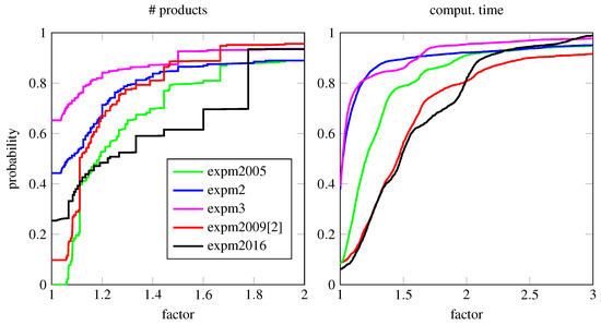 Finally, we have made a more extensive comparison of a variety of implementations tabulated in Table 4. The performance profiles of the stated methods on a larger test set of special and random matrices predominantly of dimension are displayed in Figure 5. Since the computation of the exact solution for this large test set was too costly, we only illustrated the performance plots for the number of required matrix products and the corresponding run times. The gain in computational speed is evident but less pronounced for some matrices because of the overhead from the norm estimations, which scale with . For example, we can deduce that for of the test matrices, the Padé methods require at least 50% more computational time.