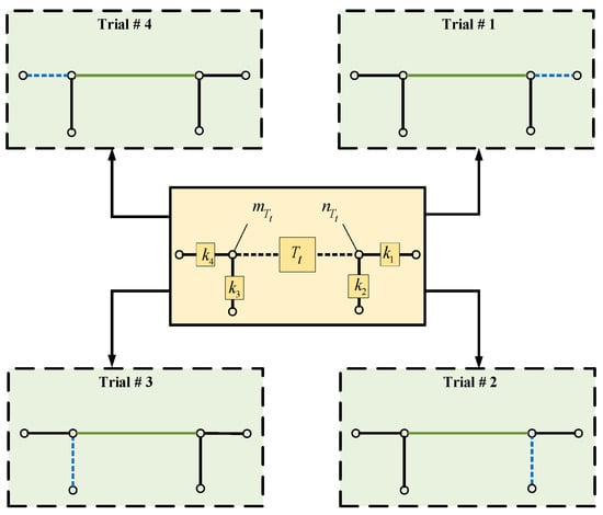 - Start from the tie-line in represented by and connected from the node to the node. A set is formed, including sectionalized lines connected by their ends to the line nodes, as shown in Figure 2, in which these sectionalized lines are proposed to be tie-lines where and do not include main feeder lines.