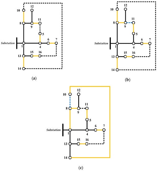 The following example illustrates the application of the proposed DNR mathematical approach on the 16-node distribution system to achieve a better power loss minimization. The DNR procedure is illustrated in Table 1 for the 16-node distribution system. Figure 3a–c illustrates the switching actions done by the proposed DNR. The candidate lines connected to the nodes are highlighted in orange. Moreover, the new tie-lines after each iteration are highlighted in blue as shown in Figure 3b,c.