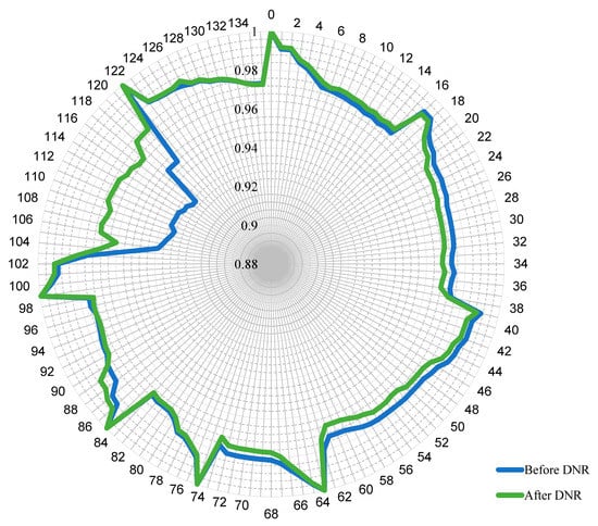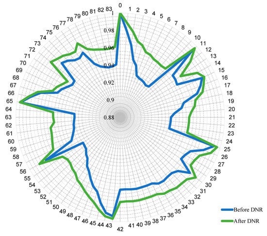 Voltage profile before and after DNR for the 83-node distribution system.
