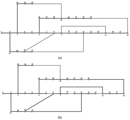 33-node distribution system: (a) Before DNR, (b) after DNR.