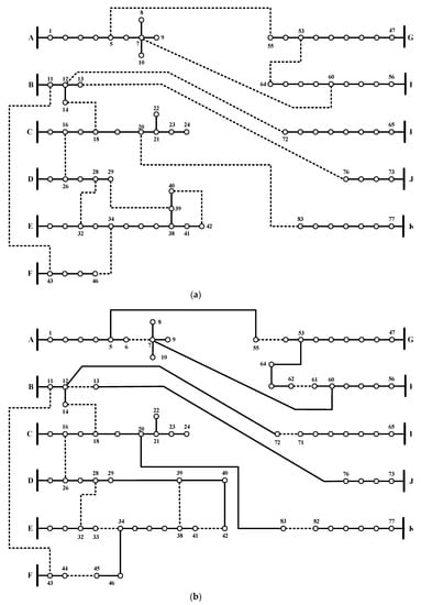83-node distribution system: (a) Before DNR, (b) after DNR.