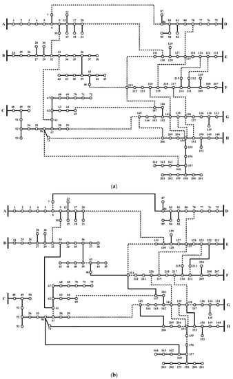 The following case study is developed in MATLAB (r2019a MathWorks Inc., Natick, Massachusetts, USA), running on a Dell Latitude E7450 laptop (Dell Inc., Round Rock, Texas, USA) with 4-core Intel Core i5 CPU (Intel Corporation, Santa Clara, California and USA) at 2.3 GHz and 8 GB of RAM. In this case study, the objective function required to be minimized is . The proposed DNR mathematical approach is tested on 16-, 33-, 70-, 83-, 136-, 415-, 880-, 1760-, and 4400-node distribution systems []. The 33-node system is a hypothetical system, in which its voltage level is 12.66 kV. Another set of the systems are illustrative systems (parts of real systems) that are used in previous works [] as 16-, 70-, and 136-node distribution systems. Their voltage levels are 23, 11, and 13.8 kV, respectively. The 83-node is a real system from a power company in Taiwan [] in which its voltage level is 11.4 kV. The 415-node system is assembled using five instances of the 83-node system with the addition of 8 new tie switches []. The 880-node is a hypothetical system in which its data were taken from []. The 1760-node system was assembled using two instances of the 880-node system by the addition of 20 extra tie switches to interconnect the two systems. The 4400-node system was built in the same manner but using 50 extra tie switches. These systems are usually examined in the literature in solving the DNR problem.