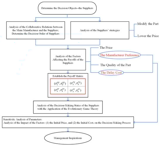 To address the research questions posed in Section 1, we conducted a supplier–supplier evolutionary game-playing model, considering the influence of the main manufacturer, with the following features:
