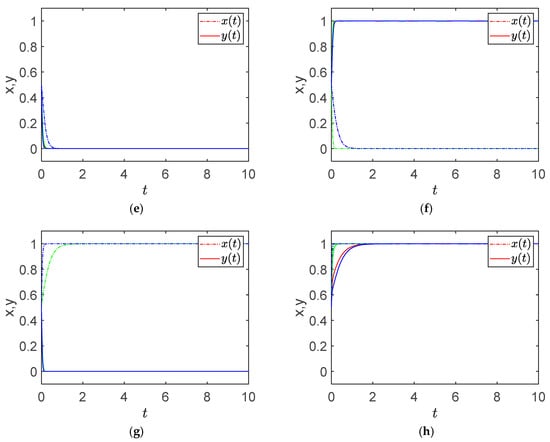 From Proposition 2, we know that  is the ESS of system (I) on the condition that  and . However, when the condition that  or  is added, it introduces some contradictions with conditions (1), (2), and (4) described in Proposition 2. We then have only one ESS in the system: .
