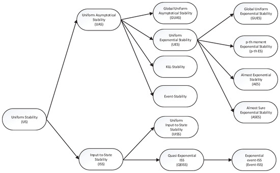 (i) The system in Equation (1) is said to be uniformly stable (US), if , there exists such that holds for with , and all .