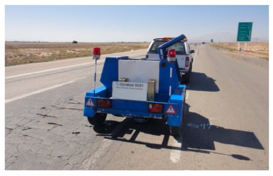 The HWD applies a tension similar to the standard axle load (8.2 t) to the pavement surface over 10 to 35 ms. A number of geophones are placed on the pavement surface at specified distances from the loading center. The task of the geophones is to record the pavement deflections induced by the load applied with the HWD device. Standard axle load simulation in HWD is generated by a series of weight drops on a loading plate placed on the pavement surface []. Table 3 reveals the details of the HWD test undertaken in this study.