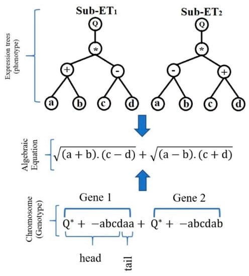 GEP is a developed GP method that solves a problem by creating expression trees (ETs). In fact, GEP is an evolutionary algorithm for creating computer programs. The designed computer programs have sophisticated tree structures that are trained similar to a living organism by changing size, shape, and composition, and adapted to the conditions. Like living organisms, GEP programs are coded as simple fixed-length linear chromosomes. Hence, GEP is a genotype-phenotype system that employs a simple genome to store and transmit genetic information and adopts a complex phenotype to explore and adapt to the environment. The genome consists of a chromosome or a fixed-length string that combines one or more genes of the same size. In fact, each chromosome contains one or more genes known as Sub-ETs. In GEP, all Sub-ETs are linked through the root with connection functions. The connection functions in GEP include division, multiplication, subtraction, and addition []. Figure 2 shows an instance of the genotype-phenotype structure in GEP.