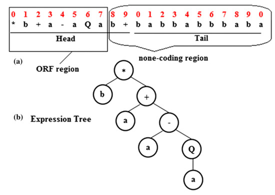 These genes, despite their fixed length, are coded for ETs of varying size and shape. It implies that the size of the coding region varies from one gene to another to allow for progressive adaptation and evolution. Each gene has a coding area called open reading frame (ORF), which, after being coded as an expression tree, provides a solution to the problem []. Figure 3 demonstrates the coding region (ORF), the non-coding region, and the expression tree for a gene.