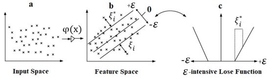 These two conditions guarantee that the new space is definable by the kernel function. The most famed kernel functions are polynomial kernel, radial basis functional kernel, linear kernel, and sigmoid kernel []. Given the above explanation, it is clear that SVR requires an appropriate function to explain the nonlinear relationship between input (xi) and output (yi) []: