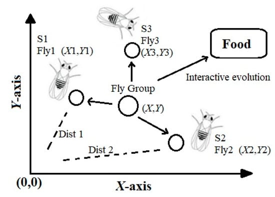 FOA is an optimization algorithm developed based on the food search behavior of the Drosophila insect []. The fruit fly has superior smell and vision senses, which discriminates it from other insects. Fruit flies track the smell of the food sources dispersed through the air and heads towards it. This insect is even capable of smell tracking from a distance of 40 km. When approaching the food source, the fruit fly employs a sense of vision to locate food and other fruit flies. The best information is shared among the fruit flies, and finally, the route leading to the food source is identified []. Figure 5 illustrates the process of food search by a fruit fly.