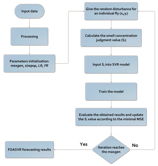The flowchart of the support vector regression optimized by the fruit fly optimization algorithm (SVR-FOA) method [].