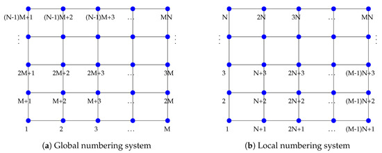 Let and . Divide the domain into a mesh with M nodes by N nodes along the horizontal and the vertical directions, respectively. Let , where , be the grid points generated by the shifted Chebyshev nodes of and let , where , be the grid points generated by the shifted Chebyshev nodes of . Thus, there are grid points in total. For computation, we index the numbering of grid points along the x-direction by the global numbering system (Figure 1a) and along y-direction by the local numbering system (Figure 1b).