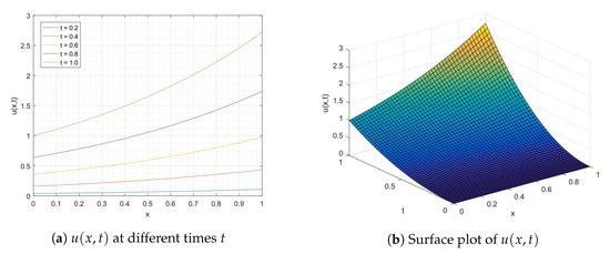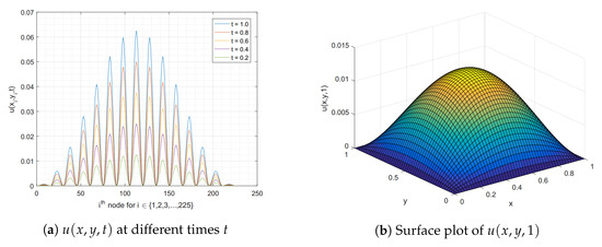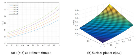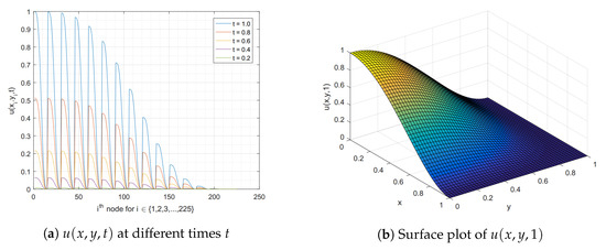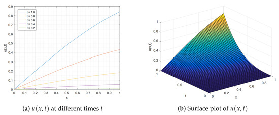 subject to the homogeneous initial conditions and the boundary conditions corresponding to the analytical solution given by Albuohimad and Adibi [25] is . For the numerical test, we choose the viscosity , and . Table 15 provides the comparison of error norms between our FIM-SCP and the CM-FDM in [25] for various values of and M, it show that our method is more accurate. Moreover, Table 16 illustrates the rates of convergence and CPU times(s) for . Figure 7a,b show the numerical solutions at different times t and the surface plot of , respectively. Note that we only show the graphical solution of since the approximate solutions and are the same.