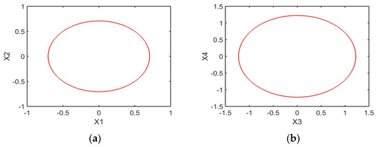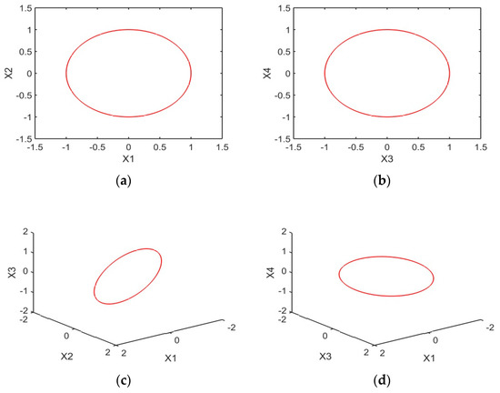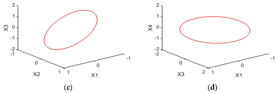 when , System (28) has one periodic solution for and no periodic solution for ; when and , System (28) has no periodic solution. Next, we show the phase portraits of the one periodic solution of System (28) in the case of and . Figure 2a,b respectively demonstrate the projections of the periodic solution on the plans and , and Figure 2c,d show the phase portraits in space and for .