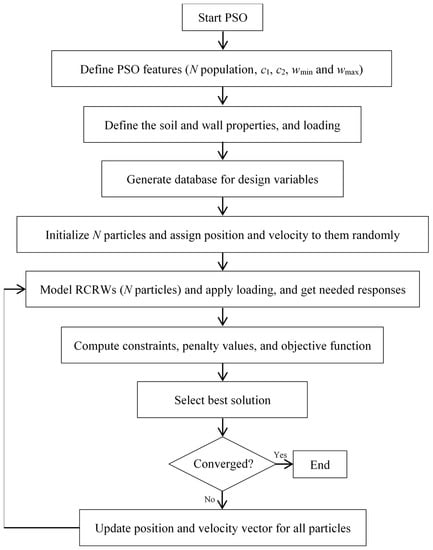 The successful application of the particle swarm optimization (PSO) algorithm in the optimum design of RC structures has been reported in the literature (e.g., [,,,,,,,]). In this paper, the PSO algorithm was used to optimize RCRWs. The algorithm was originally developed by Kennedy and Eberhart [] in the mid-1990s, and was first applied to simulate the social behavior of fish schooling and bird flocking as part of a socio-cognitive research. The PSO algorithm is considered a metaheuristic algorithm that optimizes a problem by iteratively trying to improve a candidate solution. It solves a problem by having a population of candidate solutions called particles. Each particle moves through the search space and its position is updated according to (a) its local best known position, and (b) the best known position for the whole swarm in the search space. Finally, the objective function is calculated for each particle and the fitness values of the candidate solutions are assessed to discover which position in the search space is the best. The algorithm searches for the optimum by adjusting the trajectory of each particle of the swarm in the multi-dimensional design space, in terms of paths created by positional vectors in a quasi-random manner. After finding the best values of position and velocity in each iteration k, these vectors are updated using the following equations: