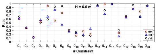 Figure 10, Figure 11 and Figure 12 show the demand to capacity ratios of the constraints (all constraints g1–3 and g5–20, except for the constraint g4 on qmin) for the optimum solutions. As can be seen, all the corresponding values were less than 1.0, indicating that the optimum solutions have satisfied all the design constraints.