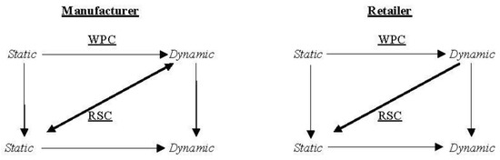 - Finally, the choice of the parameters (, w) substantially influences the retailer’s cumulative profits. Nevertheless, the retailer shows more stable and interesting results with respect to the comparison between static and dynamic settings. The implementation of the RSC is always preferred to the WPC for the higher cumulative profits generated by each combination of (, w). Notwithstanding, this result is true as long as the comparison between the two contract schemes uses the same settings. When evaluating the results of the WPC under dynamic settings with the RSC under static settings, the previous statement fails for each combination of (, w) used in the sensitivity analysis. The retailer incurs higher economic benefits by adopting WPC in dynamic settings than RSC in static settings. This result introduces a novelty in the literature. When coordinating the SC, the choice of the setting matters considerably, and the adoption of the contract scheme depends on the selection of the setting. Figure 7 reports the summary of the firms’ convenience in shifting from one configuration to another. While the results concerning the retailer are quite stable and clear, the choice of the parameters (, w) impacts the manufacturer’s decisions, which is the leading firm in terms of implementing an artificial intelligence system. Non-bold arrows illustrate the well-assessed findings in the literature, while the findings of this paper are shown in bold. Bold and double arrows represent the relationships that need further future investigations, as the results obtained are not at all definitive.