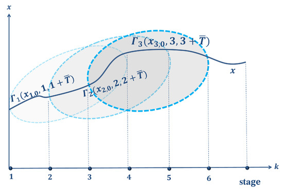 Assume that at each stage k, players have full information about the motion equations and payoff functions within k + stages, where is a fixed value, namely the information horizon. At the stage k, information about the game is updated. At the stage k + 1, players have full information about the game structure on the interval until the stage , see Figure 1.