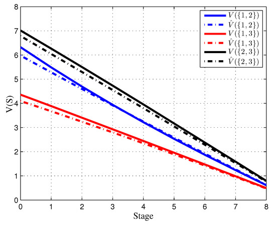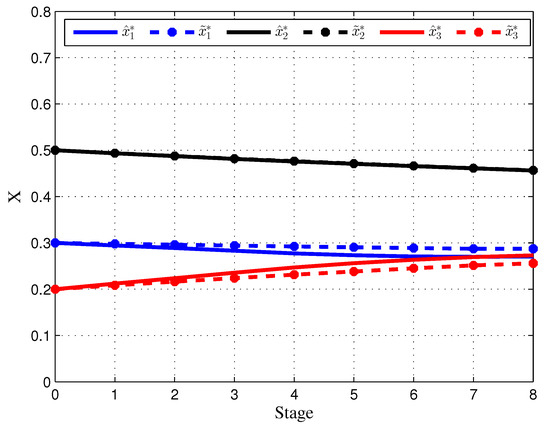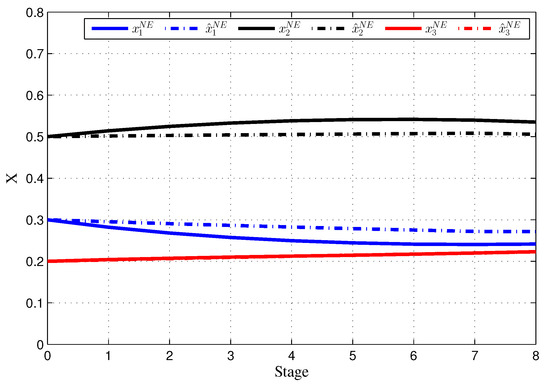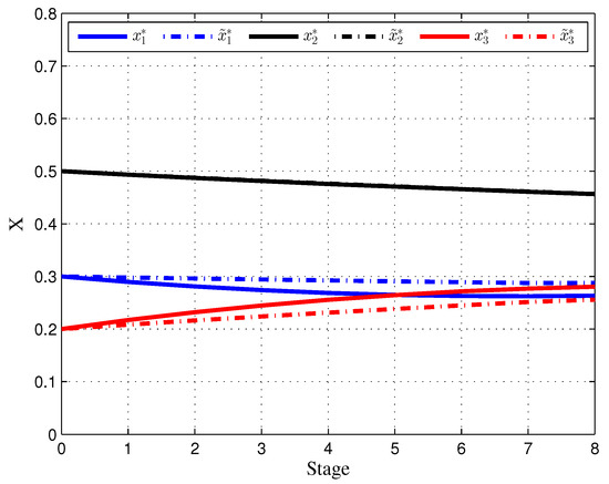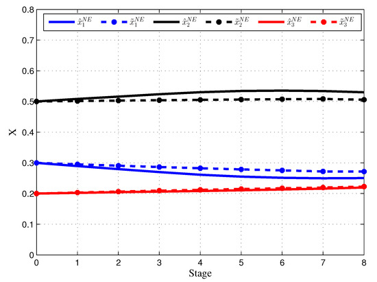 Consider a general N-stage n-person nonzero-sum discrete-time dynamic game [30] with initial state . The state dynamics of the game is defined by the following difference equation: