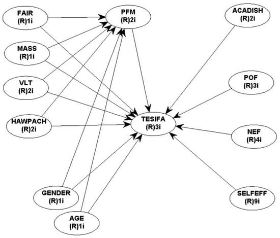 The PLS-PM analysis is aimed at maximizing the explained variance of the dependent, endogenous latent variable []. The two outcome variables used here are tax evasion and social insurance fraud acceptance (TESIFA), and piracy acceptance (PA). Preoccupation with money (PFM) serves as a mediator in the relationship between contextual and dispositional constructs and the outcome variables. Academic dishonesty (ACADISH) represents the main predictor.