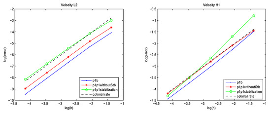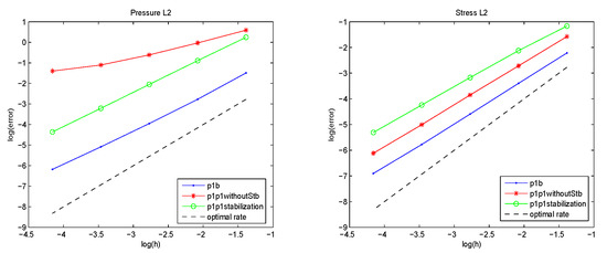 The numerical results are presented in different tables; Table 1, Table 2 and Table 3 illustrates, the numerical values for the standard FE , and , respectively. The -norm for velocity , -norm for velocity , - norm for pressure p and -norm for stress , respectively are computed for different values of . We compare the formulated results given in Table 3 with the standard result presented in Table 1. It is well-known that standard FE have better approximation which is also true for our current problem, since we compare the result of Table 2 and Table 3. The better numerical results of our scheme can be observed as expected in Table 3. Figure 1 and Figure 2 demonstrate the convergence orders for , and in , , and , respectively. As to verify our desirable feature of the method, we compare the convergence orders where the experimental result shows that the order of convergence of velocity and stress are optimal order as h decreases for all three methods. However, the pressure for without stabilization can not obtain optimal error order.