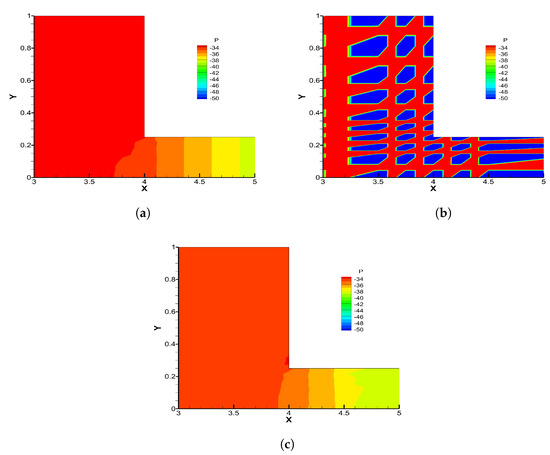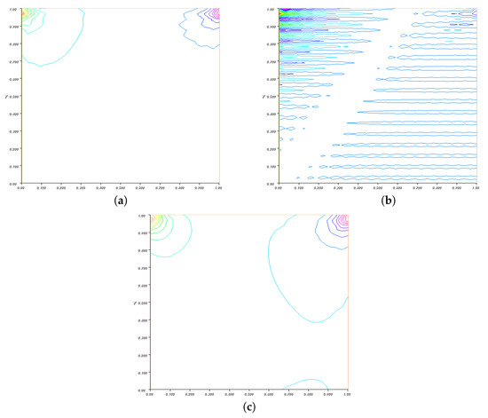 In this example, we apply the scheme in the given traditional benchmark problem for testing a numerical scheme known as “driven cavity flow”. Because, cavity flows have been used in many test cases for the testing of incompressible fluid dynamics algorithm for Stokes flow [31,42], for this example we set a domain with the following boundary condition, i.e., on the top side the velocity equal to , other boundaries are considered as zero Dirichlet condition. We consider the viscoelastic cavity problem for our numerical data comparison using the parameters , , and . The solution for the Oseen viscoelastic flow for the cavity flow is shown by the velocity field and pressure level lines. In Figure 3, we display cavity flow for three different schemes as: standard Galerkin FE approximation, without stabilized FE ( unstable) and (new scheme) stabilized FE approximation. To sum up, we can see that the standard Galerkin method and stabilized method completely resembles the physical rule for pressure. On the other hand, the result displays the pressure oscillations. As a result, the scheme is verified. Typically, through the finite element method, we have the following information as: